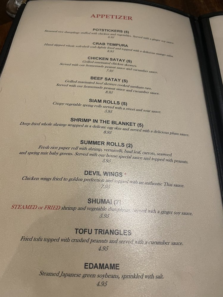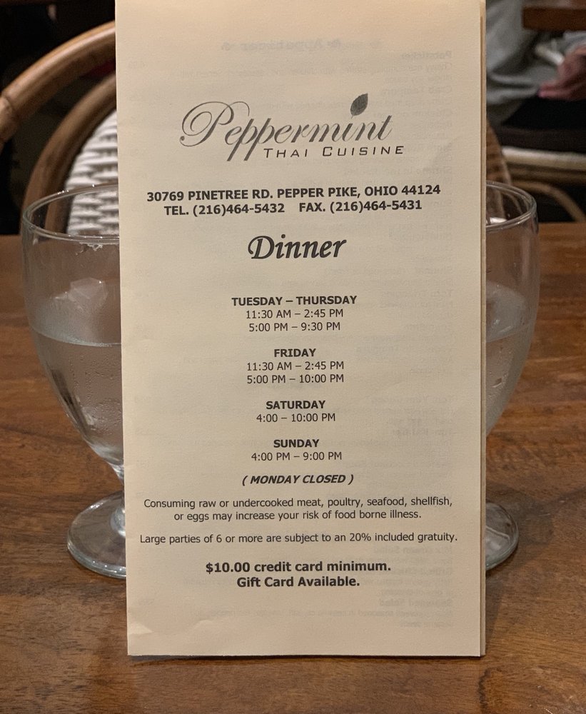 Peppermint Thai Cuisine in Pepper Pike, OH offers a casual dining experience with a full bar, making it perfect for groups and family outings. The menu features a variety of appetizers like Potstickers and Crab Tempura, soups including Tom Yum Goong and Seafood Coconut Soup, and fresh salads like Grilled Chicken Salad. Customer reviews rave about the flavorful dishes, with options for vegetarians and spice lovers alike. The cozy ambiance and attentive service make dining here a delightful experience. Don't miss out on their signature dishes like Country Pad Thai and Pad Thai, known for their authentic flavors and generous portions. Reservations are recommended for a seamless dining experience at this hidden gem of a Thai restaurant.